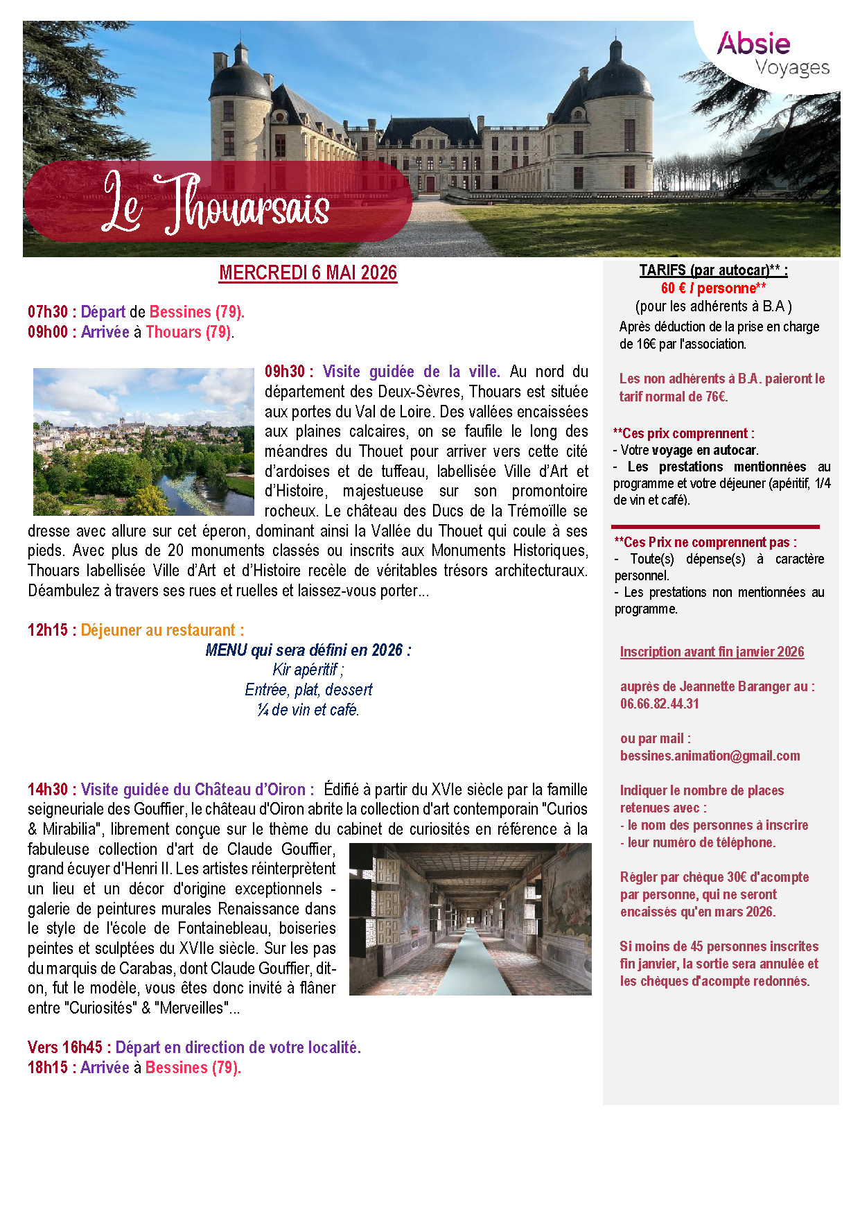 Inscription et règlement d'un acompte avant fin janvier 2026 auprès de Jeannette Baranger au 06.66.82.44.31 ou par mail à bessines.animation@gmail.com en indiquant le nombre de places réservées, le nom des participants et leur numéro de téléphone.