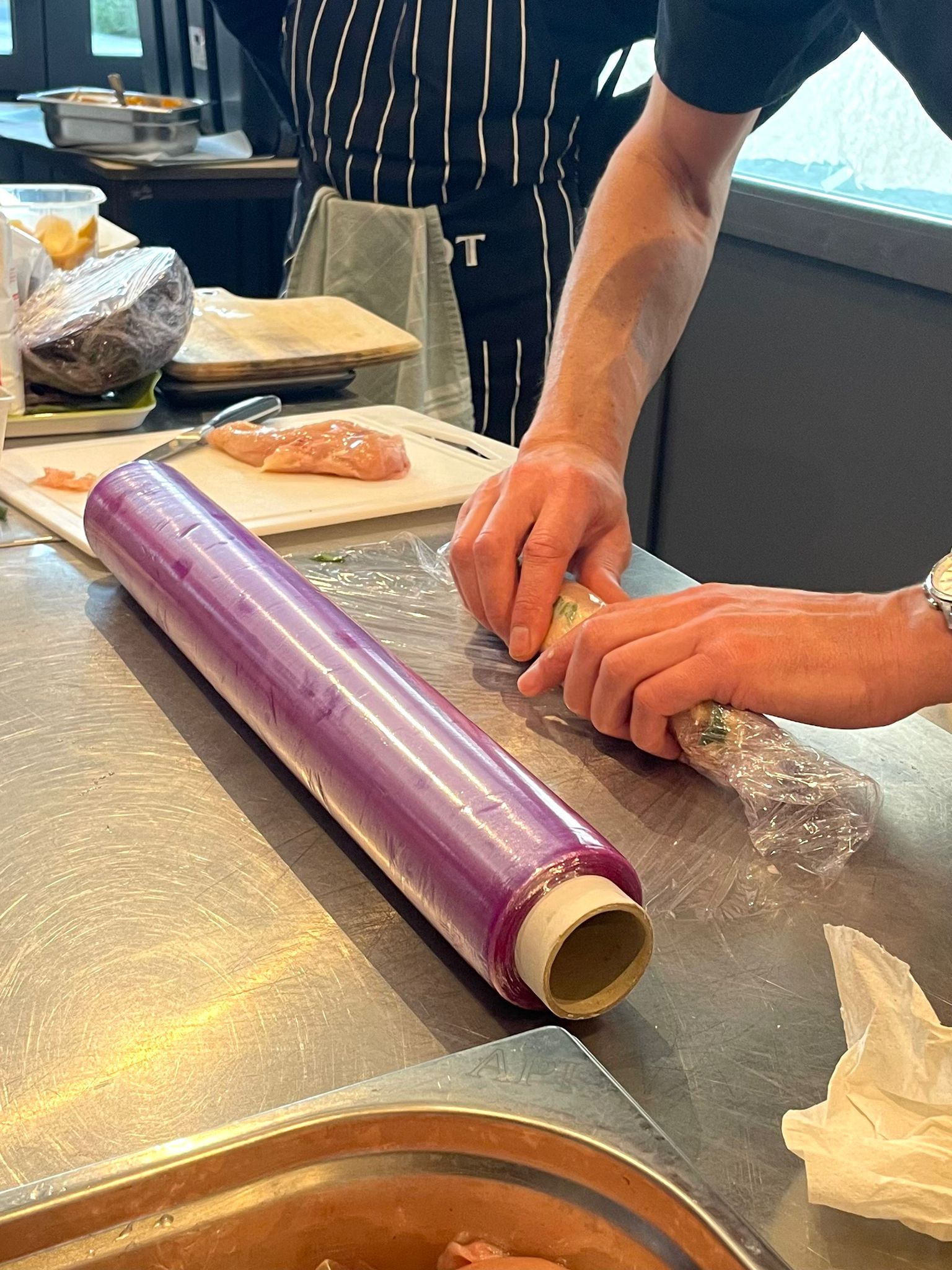 - mousseline de volaille en ballotine, pâtisson rôti, risotto de chou rouge et pancakes