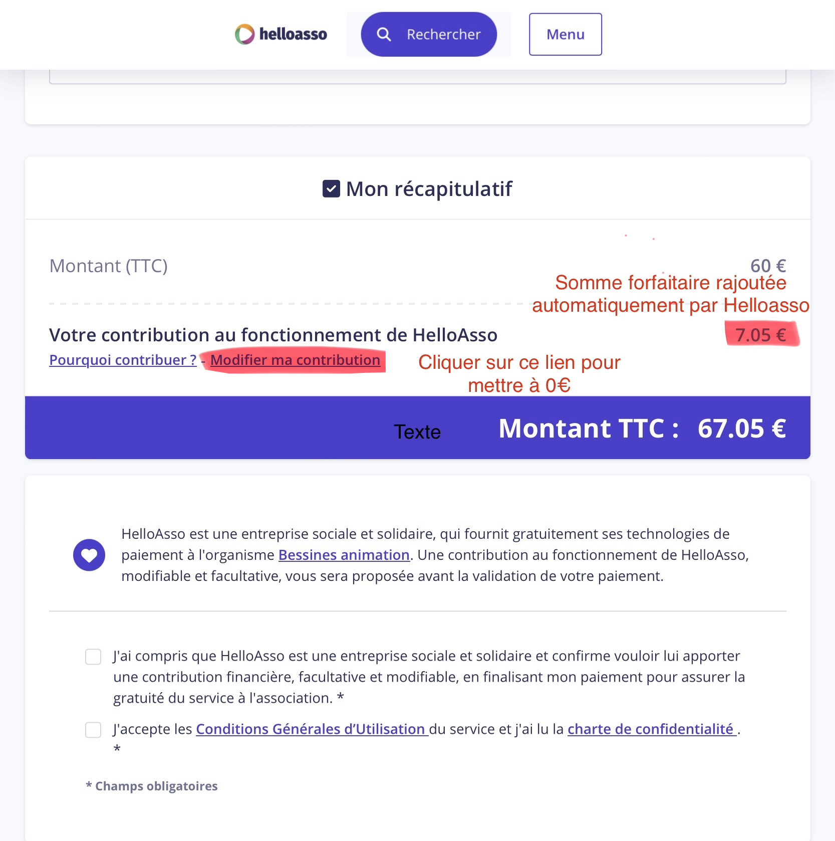 - Vous pouvez, si vous le souhaitez, faire un don à Helloasso comme cela vous sera proposé à chaque paiement : il n'y a aucune obligation ;