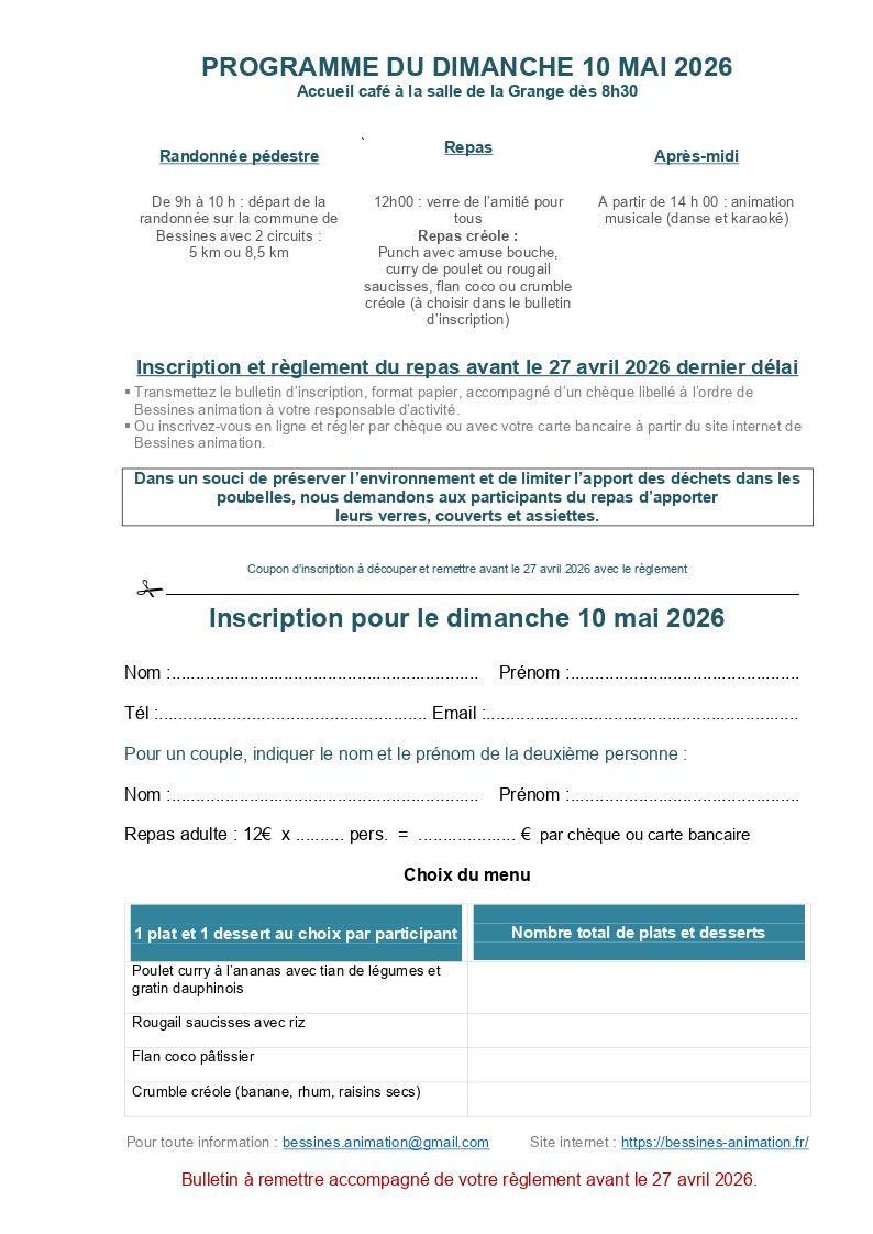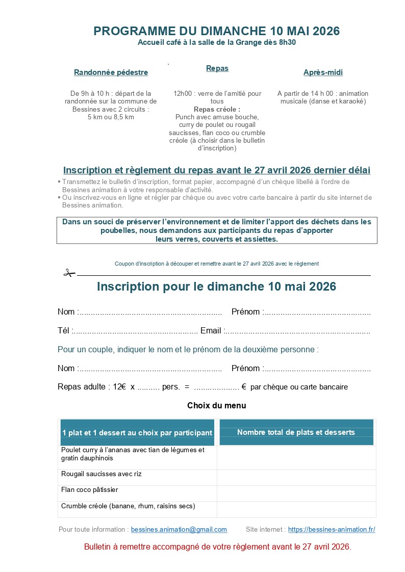 Seul le repas est payant au tarif de 12€ par personne. Inscription et règlement avant le 27 avril dernier délai.
